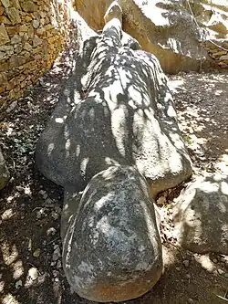 The kouros in the quarry, also known as the Kouros of Potamia or the Kouros of Faranga, is located about halfway up a 300 metre high marble outcrop and is 5.0 metres long. This statue is also unfinished and its legs are also broken off, probably as a result of being dropped at the quarry during transport, in the spot where it still remains. The figure lies on its back, away from the rock from which it was originally cut.[2] Further issues are visible. The face is missing, clear scratches are visible on the foot stumps. The roughly worked feet of the figure lie nearby, mounted on a much more recent concrete foundation.