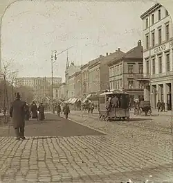 Profits were made immediately, and in 1877 an additional seven cars were delivered,[7] allowing the headway to drop to five minutes.[3] The company became a major retailer of used horses. These were sought after due to the good treatment they received at the company. However, if they ever walked down a street with tracks they would follow these blindly and it was difficult to get them to diverge off the route.[8] From 1878, the fare increased to 15 øre for all routes.[9] KSS opened its first extension on 18 March 1878, when the first part of the Grünerløkka–Torshov Line opened from Storgata to Thorvald Meyers gate. It was further extended to Beyer Bridge on 12 April 1879.[10] In conjunction with this a new depot was built at Olaf Ryes plass with place for fifty horses and a number of horsecars.[6] The Vestbanen Line was extended to Munkedamsveien on 5 May 1879.[7]