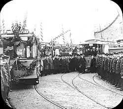 KSS had a concession which expired in 1905, at which time the municipality could purchase the company at par value. This raised a new debate concerning public or private operations, with many Conservative politicians calling for the privatization of KKS.[27] In the 1904 municipal election the issue was raised, with the Liberal Party and the socialist parties running for municipalization of tram operations. Meanwhile, the municipal administration worked with estimates for taking over KSS. A take-over would cost the municipality about NOK 2 million, while a sale would bring in about NOK 1.6 million. However, as KSS was a profitable company, it was estimated that the municipality would make more money by taking over KSS than selling KKS, estimated at about NOK 3 million for the period in question. The decisive municipal council meeting was held on 14 April 1905, although the actual vote did not occur until 02:00 hours the following day, after a nine-hour debate.[28] The Conservative majority voted in favor of selling KKS to KSS and extending the latter's concession to 1924.[29]