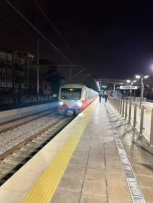 Kumkapı is a railway station on the İstanbul-Halkalı Line in Istanbul. The station is located in southeastern Fatih along Kennedy Boulevard and is 3.8 km (2.4 mi) away from Sirkeci Terminal. The station was built in 1872 by the Rumelia Railway as part of the extension of their mainline into İstanbul's city center.[3] The station was rebuilt and electrified in 1955 for the start of commuter service between Sirkeci and Halkalı.[4] Kumkapı was indefinitely closed in 2013 due to the rehabilitation and construction of the new Marmaray line. The station was rebuilt and reopened on 26 February 2024 as part of the Line T6 T6 Sirkeci–Kazlıçeşme Tramway Line / U3 Sirkeci–Kazlıçeşme Rail Line.[5]
