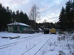 The Kushaverskoye peat railway's first line was constructed in 1967, in the area of Khvoyninsky District, Novgorod Oblast from the village Yubileyny to the swamp peat fields. The peat railway was built for hauling milling peat and workers and operates year-round. The total length of the Kushaverskoye peat narrow-gauge railway at the peak of its development exceeded 60 kilometres (37 mi), of which 16 kilometres (9.9 mi) is currently operational.[2]
