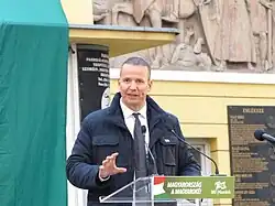 László Toroczkai (born 10 March 1978) is a Hungarian politician, journalist, leader of the far-right[6] Our Homeland Movement political party, and former mayor of Ásotthalom. He is also a member of the Parliamentary Assembly of the Council of Europe, and vice-president of Board of the Hungarian National Group of the Inter-Parliamentary Union (2022-2026).[7] Also chairman of Hungary-Bahrain Friendship Group 2022-[8] and chairman of Hungary-Rwanda Friendship Group 2022-[9]