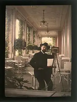 A restless and innovative photographer, Gimpel experimented with perspective, produced self-portraits using distorting mirrors[2] and experimented with night time photography. At an air show at Béthény in August 1909, Gimpel ascended in an air ballon to photograph the crowds below, pioneering aerial photography.[4] However it is his pioneering work in colour photography that he is most notable for. In 1904, Gimpel met Auguste and Louis Lumière,[2] who had just displayed their invention the autochrome to the Académie des Sciences. Limited by the long exposure time required, Gimpel used the process, to photograph still lifes and landscapes. Assisted by his colleague Fernand Monpillard, Gimpel modified the plates to produce "instant" colour pictures. Thanks to his works Gimpel was the only photographer who succeeded in capturing, in colour, scenes of everyday life during la Belle Époque.[2]