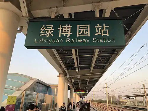 Lüboyuan railway station (Chinese: 绿博园站; pinyin: Lǜbóyuán zhàn; lit. 'Green Expo Garden station') is a railway station on the Zhengzhou–Kaifeng intercity railway. The station is 2 km north of the Green Expo Garden in Zhongmu County, Zhengzhou, Henan, China.