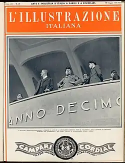 Luca Comerio's photographs of demonstrators, barricades, and the military, in the Bava Beccaris massacre of May 1898 were also published in L'Illustrazione using the early photomechanical processes.[20] Adopting further improvements in ink reproductions of photographs, the magazine introduced rotogravure and coated paper, which guaranteed better image quality, which Cinelli proposes constructed a precise fascist identity and 'self-recognition' stimulating a very strong sense of belonging to the nation.[21]