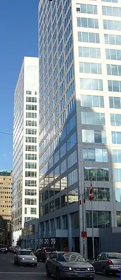 L'esplanade Laurier is an office complex in downtown Ottawa, Ontario, Canada.[1] It consists of two 23-storey towers, a three storey underground parking garage and a podium containing a two-storey shopping mall. The entire structure is clad in white carrara marble, making it clearly stand out from the other towers in the city.[2] It is located at the intersection of major Ottawa streets, Laurier Avenue between Bank Street and O'Connor Street. The lower two levels of the buildings stretch across the entire block and house a small shopping arcade.