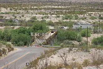 La Linda International Bridge (also known as the Gerstaker Bridge, Hallie Stillwell Memorial Bridge, Big Bend Crossing Bridge, Puente La Linda, and Heath Crossing[2][1] is an international bridge which crosses the Rio Grande (Río Bravo del Norte) on the United States–Mexico border in the Big Bend region of Texas. The southern terminus of Ranch to Market Road 2627 in Heath Canyon, it connects Brewster County with the village of La Linda in Acuña Municipality, Coahuila.[3]