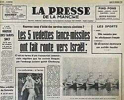 Marc Giustiniani, CEO of La Presse de la Manche, forbade his correspondent journalists from revealing the departure, on Christmas night, of five boats purchased by Israel in violation of an embargo. He insisted, against the opinion of his editorial staff, which included Paul Ingouf, René Moirand, and Guy Mabire, citing his ties to the constructor, Félix Amiot Shipyards, and the harm that such a revelation could do to the local economy. However, he offered an interview with Félix Amiot so he could explain himself in the Saturday edition. René Moirand, assigned to conduct the interview, could not reach him, as the industrialist had gone away for the weekend.[14][15]