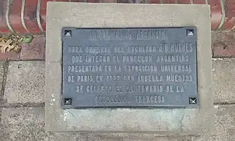 Hugues sculpted an original work in bronze for the pavilion. The National Museum of Fine Arts conserves the original plaster model of the sculpture, measuring 84 cm x 122.3 cm x 33 cm.[a] It was given to the museum in 1946 by Ignacio Pirovano, to commemorate his mother María Rosa Lezica Alvear of Pirovano. Dr. Pirovano inherited the sculpture from his grandfather, Ricardo de Lezica y Thompson, who was a member of the Argentine commission of the Paris exhibition.