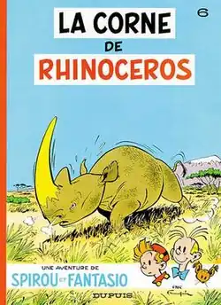 La corne de rhinocéros, written and drawn by Franquin, is the sixth album of the Spirou et Fantasio series. The material was first serialised in Spirou magazine in two parts, Spirou et la Turbotraction and the sequel La corne de rhinocéros, and finally merged into one for the release of the hardcover album in 1955.
