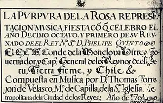 1. ^ English translation: La púrpura de la rosa, musical performance in festive celebration of the 18th birthday and first year of the reign of our King, Don Phelipe Quinto. ~ His Excellency, the Count of Monclova, Viceroy, Governor, and Captain General of the realms of Peru, Tierre Firme, and Chile & composed by Don Tomás de Torrejón de Velasco, music master of the Cathedral of Ciudad de los Reyes. In the year 1701. (Ciudad de los Reyes was the name for Lima during the Spanish Viceroyalty of Peru)
