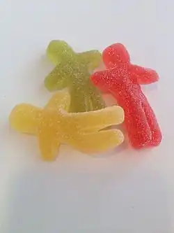 Laban is a jellyman, which is one of the stretchy gummy candies that looks like an overly plump stick figure. This candy is made by Nidar AS since 1965.[2] It was introduced to the Indian market in 2017, the first time the brand was exported outside Norway.[3]