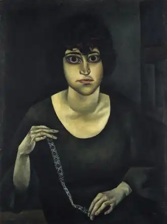 The portrait presents Shtefke Batic with lace, which is caught with the right hand on the top edge and the bottom adhere left hand. The painting is part of a series of portraits of Veno Pilon, he portrays friends, relatives and loved ones. With them he enters own new period, going from expressionism to a new reality. The colors are dark, unclear, and the overall feel of the image is static, even still. At the same time, his work marks a new emphasis on volume and with a clear purpose paints everyday life. His portraits express peace.[1][2]