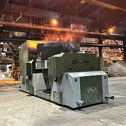 A ladle transfer car is a material handling tool which is used in foundries. The car carries a metal ladle, typically torpedo-shaped (with two pointed ends), from one location to another for processing molten metal.[2][3] It can also be called a molten steel transporter, a torpedo car, a bottle car,[4] or a Tundish transfer car.