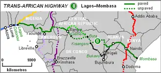 The Lagos–Mombasa Highway (also known as the Mombasa-Lagos Highway) or TAH 8 is Trans-African Highway 8 and is the principal road route between West and East Africa. It has a length of 6,259 km (3,889 mi) and is contiguous with the Dakar-Lagos Highway with which it will form (when complete) the longest east-west crossing of the continent for a total distance of 10,269 km (6,381 mi). Its main importance at the moment is connecting West Africa with Southern Africa via Yaoundé and Gabon because the section through the Democratic Republic of the Congo is unpaved and difficult.