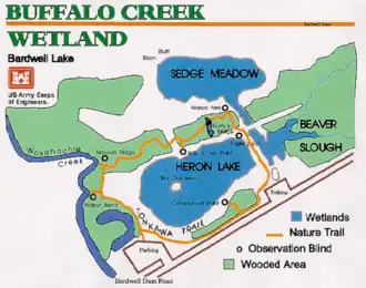 The Tonkawa Trail (Buffalo Creek Wetland Trail) is almost a mile long, and provides access to the various components of Buffalo Creek Wetland. The ground is firm due to a 4- to 6-inch layer of crushed granite. Four observation shelters along the trail provide an opportunity to observe some of the plants or animals that live in the Buffalo Creek Wetlands.[25]
