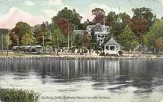 In the late 1800s, the Danbury and Bethel Street Railway, which owned the shortest electrified trolley system in Connecticut, purchased 12 acres (4.9 ha) of land on Lake Kenosia to build an amusement park.[4] The company extended their trolley line to the lake, and opened Lake Kenosia Amusement Park in 1895.[4] The park featured a wooden roller coaster, a carousel, a 1,000 seat open-air performance center, and the three-story Kenmere Resort Hotel.[4] A 30-seat steamboat called Montgomery was brought to the lake, where it became "problematic because it was far too big for Lake Kenosia".[4] Fire destroyed the hotel in 1927, and the park's popularity diminished following the opening of Candlewood Lake in the 1920s.[4]