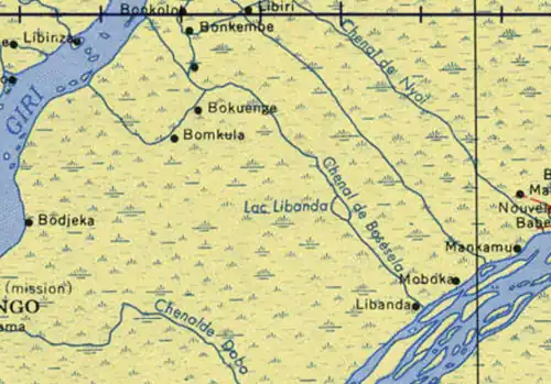 The lake was visited in 1889 during the Congo Free State by Captain-Commander of the Force Publique (the Belgian colonial military unit in the Congo) Étienne-Christophe-Bernard-Eugène Wilverth, at the time as Commanding Officer of the training camp of Umangi in the town of Lisala.[3] Making a trip to the Ngiri River, he found that a so-called Lake Ibinza did not exist and instead discovered a channel from the village of Moboka to Lake Libanda and from there to the Ngiri, near the village of Bosesera.[3] This channel was named the Bosesera Channel.