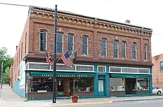 The Joseph Bosch Building (1888), located at 300 Calumet, was built by brewer Joseph Bosch, who had settled in Lake Linden in 1868, working as a miner of the Calumet & Hecla company.[2] He left the town to learn to be a brewmaster, and in 1874 founded the Torch Lake Brewery.[2] The company was an immediate success, and in 1899 was the largest brewery in the Upper Peninsula.[2] This building also has arched second-story windows with keystones, and a metal cornice. A 1920s era sign for Lindell Chocolate Shoppe hangs in front of the building.[2]
