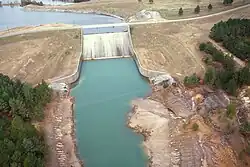 The concrete-and-earthfill dam is 10,600 feet (3,231 m) long. The crest of the spillway is 249.5 feet (76.0 m) above mean sea level. The conservation storage capacity is 250,000 acre-feet (310,000,000 m3) with a surface area of 18,680 acres (76 km2). The bayou has a length of 140 miles (225 km) and a total drainage area of 850 square miles (2,201 km2). The lake's normal conservation pool is 230 feet (70 m) above mean sea level. The lake provides water supply storage for the Northeast Texas Municipal Water District which serves the cities of Jefferson, Ore City, Lone Star, Avinger, Hughes Springs, Daingerfield, and most recently Longview. The water supply storage exists in the conservation pool between elevations 201 to 230 feet (70 m). Water intake structures are located at various points on the lake and one downstream of the lake. Discharges from the two gates in the control structure located on the southeast end vary from a minimum of 5 cu ft/s (0.14 m3/s) to a maximum of 3,000 cu ft/s (85 m3/s).