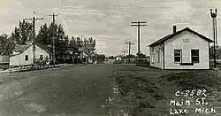 By 1877, a community named Lake Station formed around the train depot. A post office named Crooked Lake opened on February 28, 1877, with railroad agent Charles Howard Bates serving as the first postmaster. The name came from the nearby Crooked Lake. The original train depot was struck by lightning and burned down in 1892 during a severe storm that devastated the surrounding area. A new depot was soon built in its place.[17] In 1897, Garfield Township was set aside from the southwestern portion of Surrey Township, and Crooked Lake would become part of the new township. The name of the post office was shortened to Lake on March 11, 1909.[18] Among the oldest remaining structures in the community include the Lake General Store, which has been in operation since 1904.[16]
