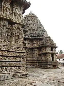 According to art critic Gerard Foekema, the temple as a whole exhibits the "new style" and belongs to the 2nd phase of Hoysala building activity (13th century), with two sets of eaves, and six moldings at the base of the outer wall.[7] The first eave is located where the superstructure meets the temple outer wall and the second eave runs around the temple and about a metre below the first eave. In between the two eaves are decorative miniature towers on pilasters (called Aedicule), with sculptured wall images of Hindu deities and their attendants below the second eave.