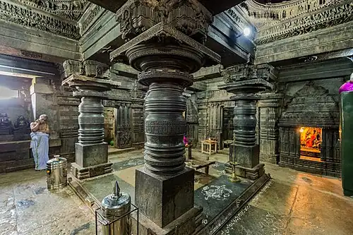The interior of the temple consists of a closed hall (mantapa) of modest size with four polished lathe turned pillars supporting the roof.[12] The four central pillars divide the hall into nine equal "bays" (compartments) and nine decorated ceilings.[13] The sanctum of the three shrines contain the images of Venugopala, Narayana in the middle and Lakshminarasimha; all forms (Avatar) of Vishnu.[8]