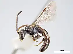 These bees are around 5 mm long, with relatively large wings for their body size. Most of the body is covered with hair. Their appearance is described as fly-like,[1] and small and agile.[2] They have short tongues, but this does not restrict their ability to gather pollen.[3] Females have wider abdomens than the males. They appear very similar in colour and shape to a honey bee, however, the small native bee is not as stout. Lasioglossum sordidum often get mistaken for flies or go completely unnoticed as they look like small flies.[4]