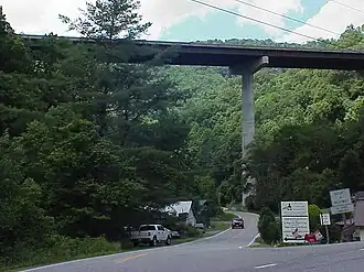 The Laurel Creek Gorge Bridge is a continuous steel plate girder bridge that spans Laurel Creek on Interstate 26/U.S. Route 23 between Asheville, North Carolina and Johnson City, Tennessee. It is the second tallest bridge in North Carolina—after the Peter Guice Memorial Bridge—with a deck height of 220 ft (67 m).[2] Construction of the bridge was finished in 2002.[1] Due to its proximity to the higher mountains and its elevation of over 3000', the highway in this area is subject to heavy snow and icing. The bridge design incorporates a special system which sprays de-icing liquid onto the bridge deck whenever icing is detected.[2]