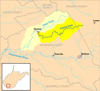 The Laurel Fork is a tributary of the Clear Fork, 23.5 miles (37.8 km) long,[3] in southern West Virginia in the United States. Via the Clear Fork and the Guyandotte and Ohio rivers, it is part of the watershed of the Mississippi River, draining an area of 56.4 square miles (146 km2)[4] in a rural area on the unglaciated portion of the Allegheny Plateau.