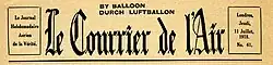 Le Courrier de l'Air was a French-language propaganda newspaper distributed as a leaflet during the First World War. It was printed in London and dropped from hydrogen-filled, free-floating paper balloons on the Western Front over France and Belgium. The newspaper was the product of a division of the British Military Intelligence Service, known as MI7b. The first issue appeared on April 6, 1917.[1] A propaganda magazine of the same name was also used by the British side against Germany during the Second World War.