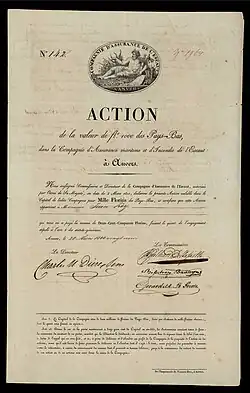 Share of the Compagnie d'Assurance de l'Escault, issued 20 March 1821, signed by Count Gérard Le Grelle