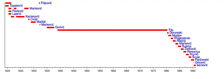 The 2nd Congress, convened on 20–25 June 1920, renamed the party the Communist Party of Yugoslavia (CPY). It also established the office of president of the Central Council, which existed alongside the offices of secretary and technical secretary until the party's banning in 1921.[4] The ban forced the party underground, and a new leadership headed by Triša Kaclerović was established by the 6th Session of the Central Council of the 2nd Congress, held on 2–3 June 1921.[5] An indirect consequence of the ban was that the offices of president and technical secretary were abolished. At the 3rd CPY Congress, held on 17–22 May 1926, the secretaryship was named political secretary while the Central Council was renamed the Central Committee. From then on, the party leader's formal title was political secretary of the party Central Committee. With the party facing fierce troubles during the 1920s and early 1930s, the leadership was continually reorganised by the Communist International (Comintern). On 8 December 1936, the Executive Committee of the Comintern decided to designate the incumbent political secretary, Milan Gorkić, as general secretary of the CPY Central Committee.[6] The name change informally consolidated Gorkić's powers, in part because the Soviet communist party was headed by a general secretary. Gorkić held the post for less than a year due to being recalled to the Soviet Union in the middle of 1937, where he was accused of counter-revolutionary activities and executed by state authorities.[7]