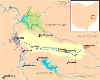Leatherwood Creek rises just outside the western boundary[5] of the village of Barnesville in Warren Township in Belmont County and flows generally westward, first through a small portion of northeastern Beaver Township in Noble County, and into Guernsey County where it flows through Millwood, Richland, Wills, Center, and Cambridge townships, and through the villages of Quaker City, Salesville, and Lore City. It flows into Wills Creek in the southern part of the city of Cambridge.[6]