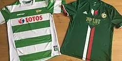 The 70th anniversary shirts used by Lechia Gdańsk (left) for the 2015–16 season, and Śląsk Wrocław (right) for the 2016–17 season.