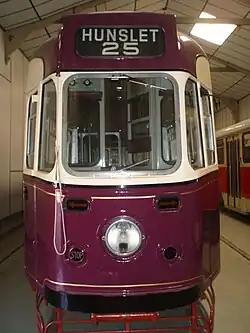 Leeds 602 was one of three experimental tramcars built for Leeds City Tramways, the others being Leeds 600, and Leeds 601. Car 602 entered service on 1 June 1953, and was built by bus manufacturer Charles H Roe. The design of 602 owes a lot to the Glasgow Cunarders and Coronations, because the General Manager of Leeds at the time was A. B. Findlay, who did at one stage produce drawings of a single-decker Cunarder. Findlay used these ideas to build two identical prototypes (601 and 602), and Leeds 602 was fitted with VAMBAC equipment under the Bow Collector. In addition, all its fittings are electrical, making it a very complicated tram.[1][2]