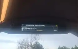 ![]() A route V2 bus heading to Manchester Royal Infirmary approaching the Newearth Road stop on the guided busway section in June 2025. | |