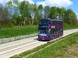 Services were initially operated by 20 Wright Eclipse Gemini 3 bodied Volvo B5LH hybrid double-decker buses in purple-livery. These were equipped with CCTV and next stop audio and visual announcements, USB charging points and free Wi-Fi.[22] Five more buses were purchased in January 2017 to provide extra capacity at busy times and facilitate the extended service to Central Manchester Hospitals.[23][24] Further buses entered service in September 2018 to operate the V4 service from Ellenbrook, as standard vehicles not adapted for busway running.[25]