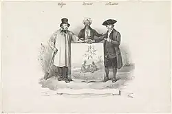 Allegorical Coat of Arms on the appointment of Du Bus de Gisignies as Commissioner. Showing a Belgian and a Dutchman shake hands, while a Javanese stands behind the shield and his hands on the arms of both men. (3 February 1826)