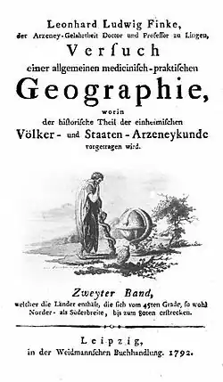 Finke's major work was Versuch einer allgemeinen medicinisch-praktischen Geographie (3 volumes, 1792โ95).[1] It was the first work of medical geography with a world-wide scope.[2] He was influenced by Johann Peter Frank, and encouraged by James Lind. In turn, Finke influenced August Hirsch, and was a precursor of Humboldtian medicine.[3] Finke worked on an unpublished nosological map. It was based on the same principles as the zoological maps of Eberhard August Wilhelm von Zimmermann, but with indigenous diseases instead of animals.[4]