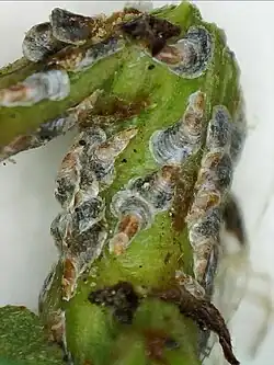 The adult female oystershell scale is up to four millimetres long, elongated, tapering to a point at the posterior end and often slightly curved, somewhat resembling a mussel shell. The upper side is a banded, brown, waxy scale and the underside is cream coloured. There are no eyes or legs and the short antennae have only a single segment. The mandibles are lengthened into a stylet adapted for sucking sap. The female lays about one hundred oval white eggs, retaining them under her body, and then dies. Her scale darkens in colour and stays in place, protecting the eggs over the winter. They can survive temperatures as low as -32 °C.[1] They hatch in the spring at about the time the host plant's buds are bursting. The crawlers are tiny and disperse on the host, each one looking for a suitable protected site with thin bark in which to settle, remaining in that place permanently after sinking the stylet into the host plant's vascular tissues.[2] The crawler moults twice before becoming an adult female, forming a protective scale from larval exuviae and secretions. Some crawlers may develop into males. These undergo four moults and the adult males have eyes, three pairs of legs, one pair of wings, a head and a body divided into a thorax and abdomen. Not all colonies produce males and bisexual and parthenogenetic populations are known.[1]