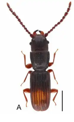 Adults reach a length of about 2.5–3.8 mm. They have a brownish red body, while the legs, antennae, mouthparts and humeral areas of the elytra are somewhat paler.