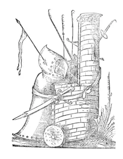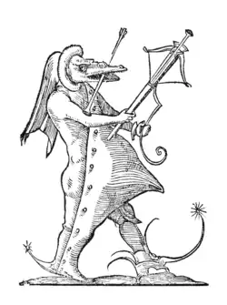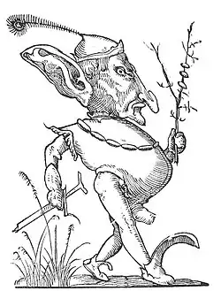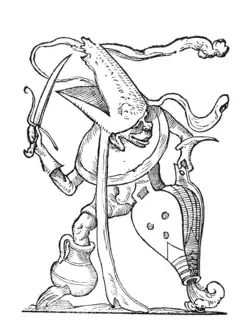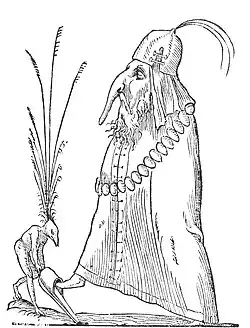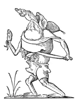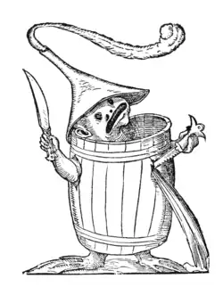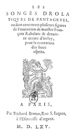 Published roughly a decade after the death of François Rabelais, a prominent writer and humanist in France, Les Songes drolatiques was attributed to Rabelais by its publisher. Its title refers to the title character of Rabelais' most famous work, Pantagruel, and Breton claims in the preface that the pictures represent the last works of Rabelais before he died.[1] The word "drolatic" is an archaic term coming from French "drolatique", meaning "humorous" or "amusing". In the title it functions as an adjective for "dream", suggesting that the images were supposed to have been taken from the dreams of the giant Pantagruel.[2]