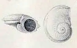 | Original drawing with two views of a shell of Leucorhynchia tricarinata | |