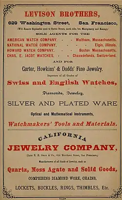 Levison Brothers / California Jewelry Co. was active from 1859 to 1935. Founded in 1859,[1] they occupied 629 Washington Street, San Francisco, California by 1863,[2] and by 1871 moved into two floors of their own building at 134 Sutter Street, San Francisco, furnished with machinery, tools, and appliances powered by a 25-horsepower engine.[3]