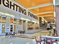 The school's football team were state finalists in 1972, state semifinalists in 1979, and won state championships in 1993 and 1996 (at which time the team was featured on the "Team Cheerios" cereal box).[2] The 1996 Farmer football team set the championship game record for most yards gained on the ground (547, the team did not attempt a single pass during the game), while the combined score of 92 in the game set a new record for most points in an 11-man title game.[9] An earlier team achieved notability for a different reason in 1946, when members of the Fighting Farmer football team chased a bank robber until he was exhausted, allowing for his capture by an unarmed gas station attendants.[2]