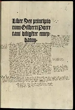 The Liber sex principiorum (or Liber de sex principiis) is an anonymous Latin work of philosophy from the late twelfth century. It aims to complement Aristotle's Categories by providing justifications for the six categories neglected by Aristotle in his scheme of ten categories.[1] The "six principles" (categories) of the title are place, time, position, possession, action and passion (on top of substance, quality, quantity and relation).[2] The Liber became one of the standard works of the logica vetus ('old logic') curriculum and by the mid-thirteenth century was erroneously ascribed to Gilbert de la Porrée. It was widely commented upon by medieval philosophers, including Robert Kilwardby, Nicholas of Paris, Martin of Dacia, Radulphus Brito, Peter of Auvergne and Thomas of Erfurt.[1] Nevertheless, the complete text does not survive, only fragments.[2]