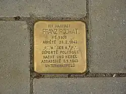 Franz Rochat, a professor, pharmacist, and director of an important pharmaceutical laboratory, was born on 10 March 1908 in Saint-Gilles. He was a worker in the underground press, and the resistance publication Voice of the Belgians. He was arrested on 28 February 1942, arrived at Untermaßfeld in April 1944, and died there on 6 April 1945.