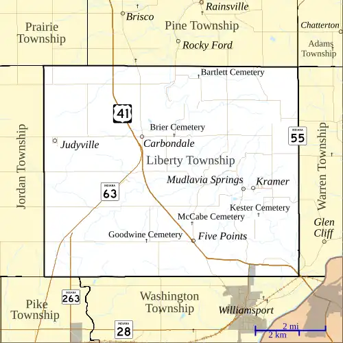The north end of the county seat of Williamsport extends into the southeast corner of the township. In addition, there are three small unincorporated towns in the township. Carbondale is located just north of the point where State Road 63 begins at U.S. Route 41. Judyville is about 2 miles (3.2 km) west of Carbondale, near the western border of the township. Kramer is located about 3 miles (4.8 km) east-southeast of Carbondale, near the site of the Hotel Mudlavia. The settlement of Five Points is now defunct, but existed along the present-day route of U.S. Route 41 in the southeastern part of the township.