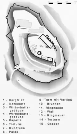 Ground plan of the castle. 1 Bergfried, 2 Ladies' apartment, 3 & 4 Domestic buildings, 5 Chapel, 6 & 14 Gate towers, 7 Round tower, 8 Great hall, 9 Tower with dungeon, 10 Well, 11 & 13 Curtain walls, 15 Dry moat